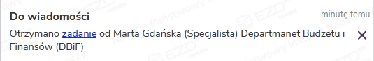 • Jest to powiadomienie pojawiające się na koncie osoby, dla której wystawiono zadanie. Może to być zadanie Do dekretacji (np. w przypadku przesyłki wpływającej), Do realizacji, jak również Do akceptacji lub Do podpisu dla przełożonego. W treści takiego powiadomienia znajduje się odnośnik pozwalający przejść do widoku, w którym realizowane jest zadanie.