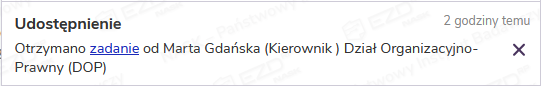 • Powiadomienie otrzyma użytkownik, któremu poprzez zadanie zostały udostępnione dokumenty z akt sprawy w celu współpracy lub do zapoznania się z nimi. W tego typu powiadomieniach znajduje się odnośnik pozwalający przejść do widoku, w którym realizowane jest zadanie.