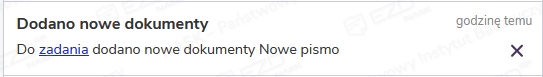 • Powiadomienie pojawi się na koncie użytkownika, który otrzymał wcześniej zadanie udostępnienia, a wystawiający zadanie doudostępnił do tego zadania kolejne dokumenty.