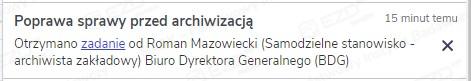 • Powiadomienie pojawia się na koncie użytkownika, któremu pracownik archiwum wystawił zadanie zobowiązujące do poprawienia pisma niestanowiącego akt sprawy znajdującego się w poczekalni archiwum. W treści powiadomienia znajduje się odnośnik pozwalający przejść do widoku, w którym realizowane jest zadanie.
