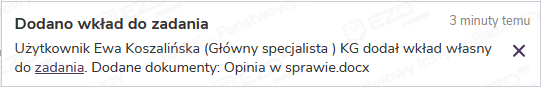 • Powiadomienie otrzyma użytkownik, który utworzył zadanie Udostępnienia do realizacji i otrzymał do udostępnionych dokumentów przygotowany przez wskazanego pracownika wkład własny.