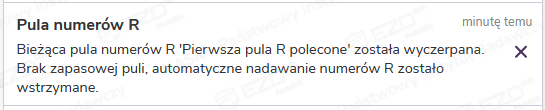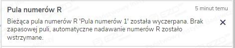 • Powiadomienie dotyczące puli numerów R otrzyma administrator w sytuacji, gdy liczba numerów R osiągnie stan wskazany w widoku Administracja > Ustawienia > Korespondencja wychodząca.