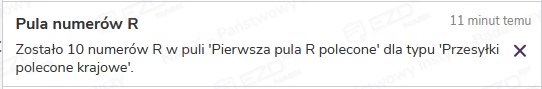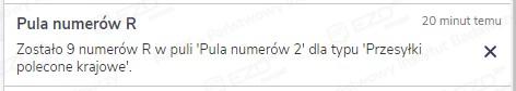 Powiadomienie takie administrator otrzyma również wówczas, gdy pula numerów dodana na poziomie Administracja > eNadawca > Pula numerów nadawczych R zostanie wyczerpana.