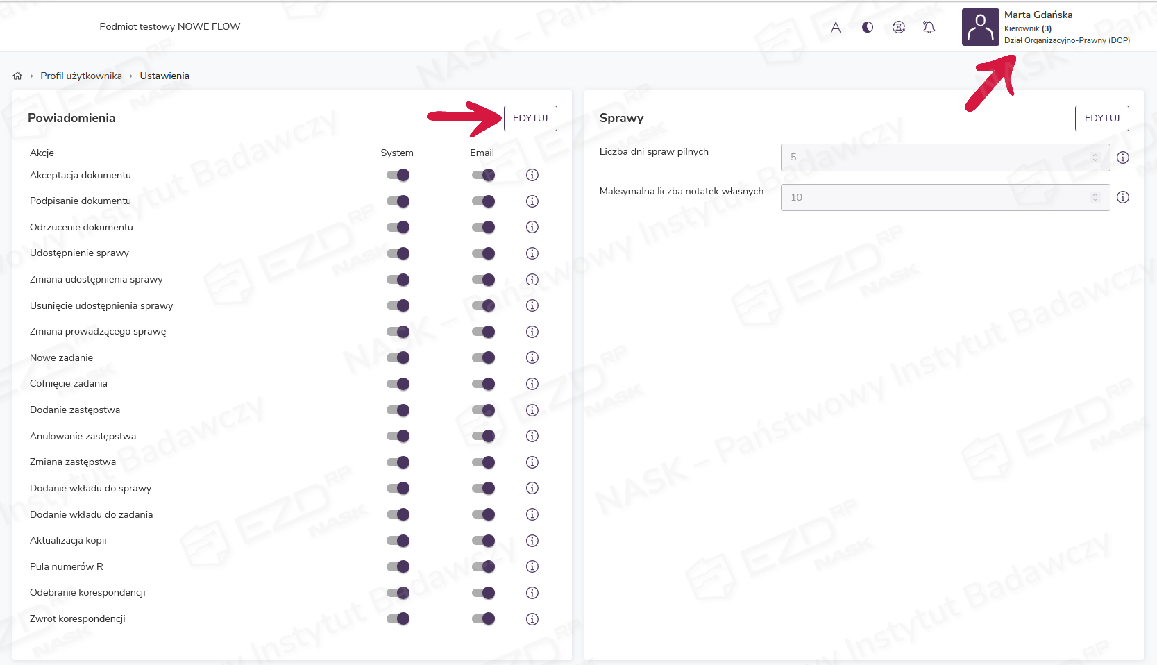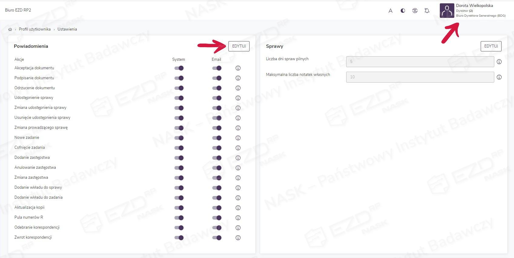 Po kliknięciu obszaru z imieniem i nazwiskiem, który znajduje się menu górnym, pojawi się menu kontekstowe. Należy kliknąć w nim pozycję Ustawienia, a następnie odszukać sekcję Powiadomienia. Można w niej wybrać rodzaje powiadomień, które będą się pojawiały pod ikoną dzwonka, oraz te, które zostaną przekazane drogą e-mailową. Zmiana ustawień jest możliwa po uprzednim kliknięciu przycisku Edytuj.