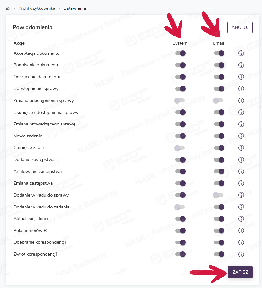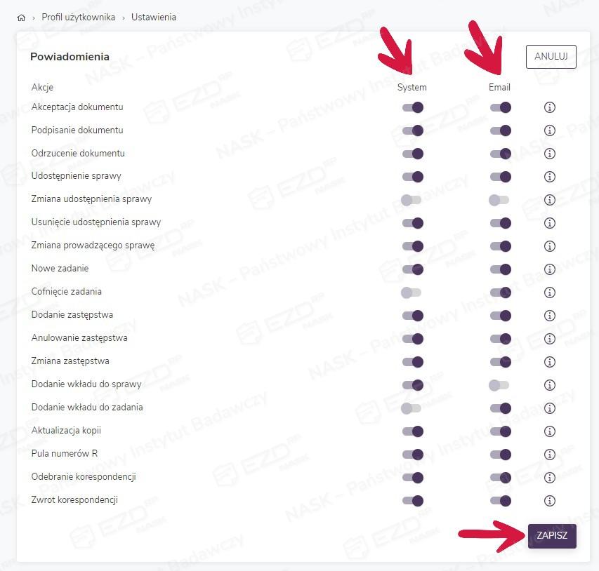 Aby włączyć/wyłączyć dany rodzaj powiadomienia, należy kliknąć suwak dostępny przy interesującej nas opcji – przesunięcie znacznika w prawo i zmiana koloru z szarego na granatowy oznaczają, że powiadomienie jest aktywne. Zmiany zatwierdzamy przyciskiem Zapisz.