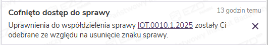 Powiadomienie o tym samym tytule otrzyma użytkownik współdzielący sprawę, jeśli prowadzący usunie znak sprawy, do której nadał mu dostęp.