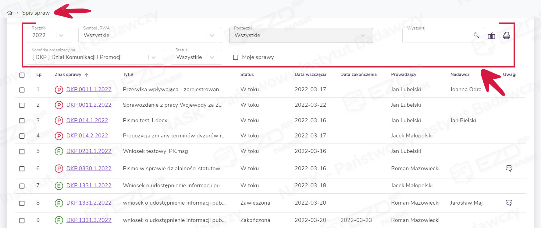 W menu głównym systemu dostępny jest moduł Spis spraw, który służy do przeglądania wszystkich spraw prowadzonych w danej instytucji, jak i zarejestrowanych spraw zalogowanego użytkownika. Sprawy są pogrupowane zgodnie z symbolami i klasyfikacją jednolitego rzeczowego wykazu akt (JRWA).