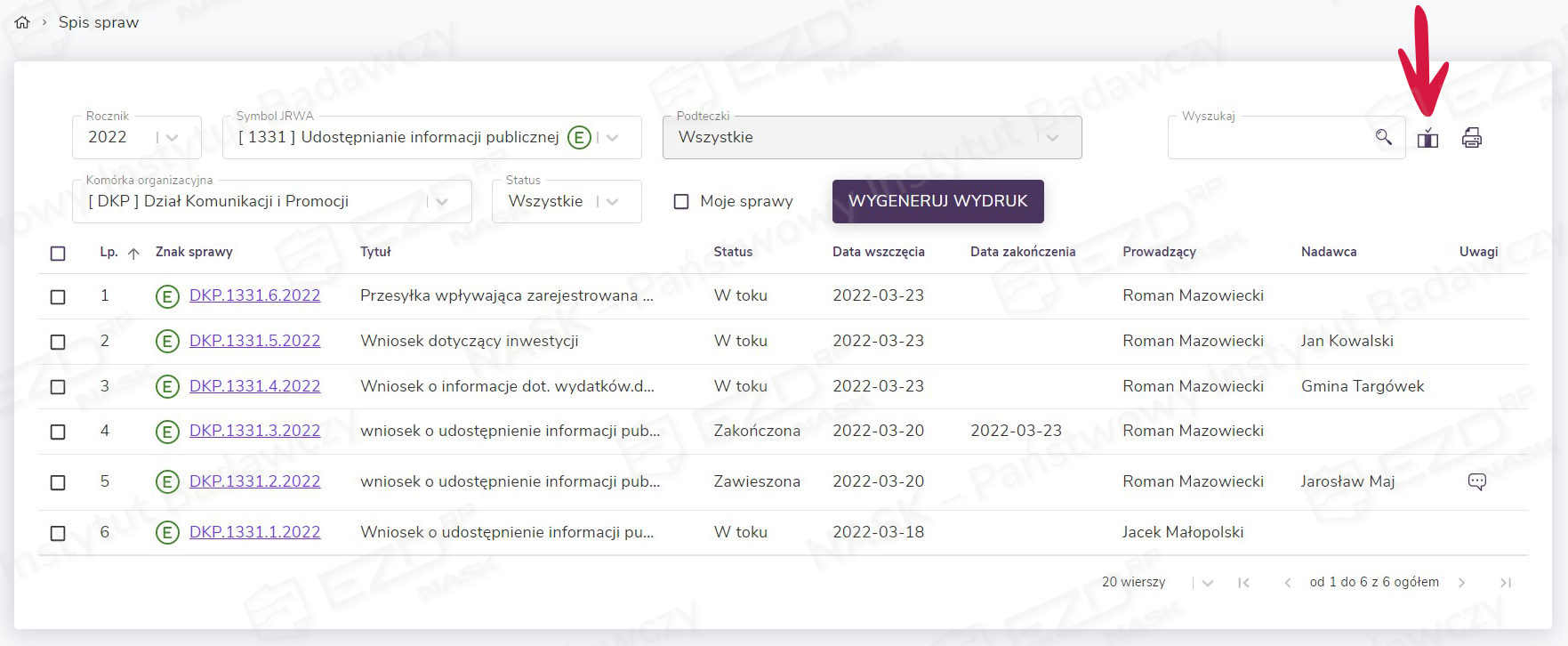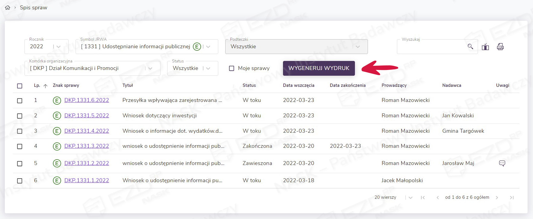 W przypadku filtrowania spraw według kategorii Symbol JRWA w widoku sekcji pojawi się przycisk Wygeneruj wydruk. Użycie tej opcji umożliwia utworzenie pliku w formacie PDF zawierającego spis spraw wskazanej klasy JRWA według cech wybranych przez użytkownika.