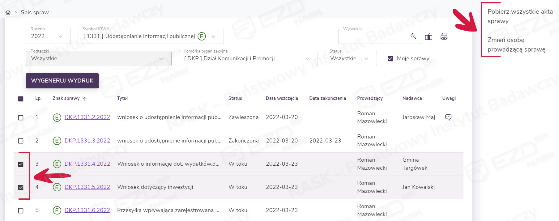 Z kolei po zaznaczeniu pola lub pól wyboru przy numerze konkretnej sprawy, lub numerach kilku spraw w prawym menu wyświetlona zostanie dodatkowa opcja Pobierz wszystkie akta sprawy. Jeśli wybrane sprawy mają status W toku i użytkownik ma nadane dodatkowe uprawnienia, w menu będzie również dostępna opcja Zmień osobę prowadzącą sprawę.