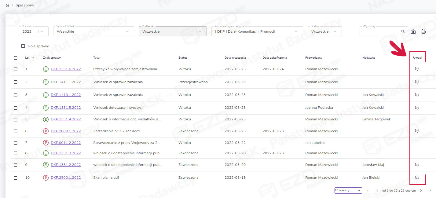 W widoku spisu spraw ważną funkcję pełni kolumna Uwagi. W zależności od czynności wykonywanych na danych sprawach, pojawią się w tej kolumnie odpowiednie ikony. Po ich kliknięciu system wyświetli okno zawierające Uwagi do sprawy.