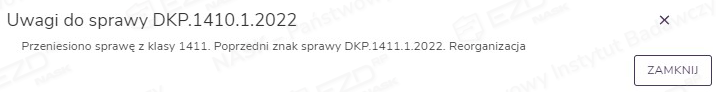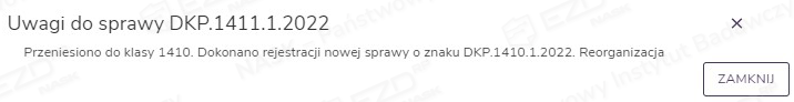 Przy sprawie ze starym znakiem w polu Uwagi również będzie widoczna ikona. Po jej kliknięciu na ekranie pojawi się informacja o przeniesieniu sprawy do innej klasy oraz numer nowej sprawy, pod który została ona przerejestrowana.