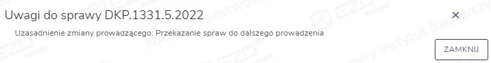 Jeżeli z poziomu spisu spraw został zmieniony prowadzący sprawę, w polu Uwagi również będzie widoczna ikona, dzięki której możliwe będzie zapoznania się z uzasadnieniem takiej zmiany.