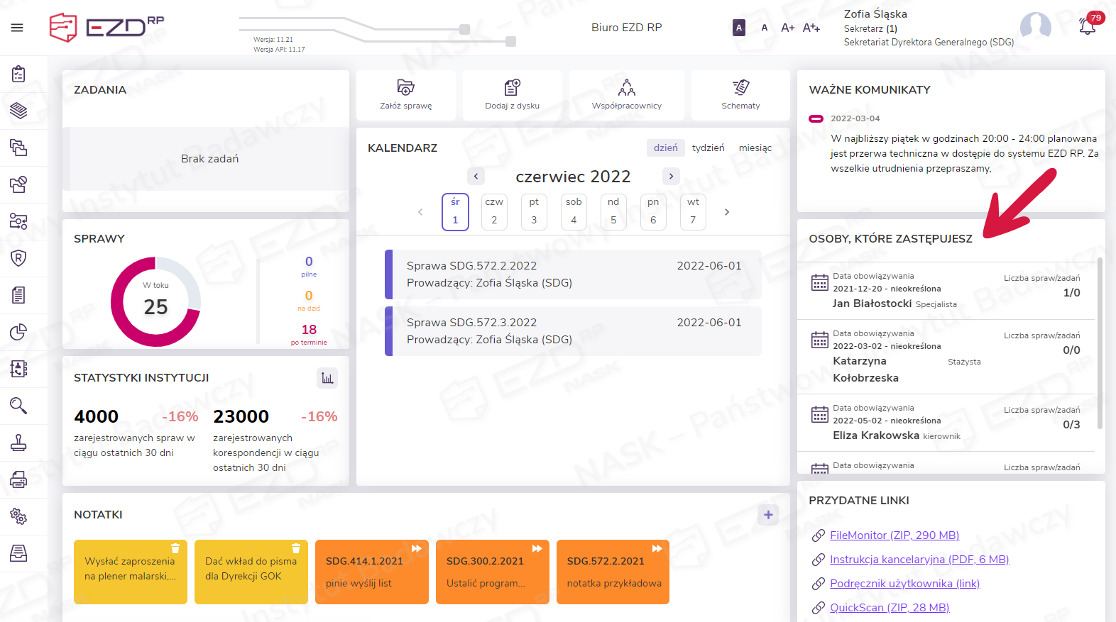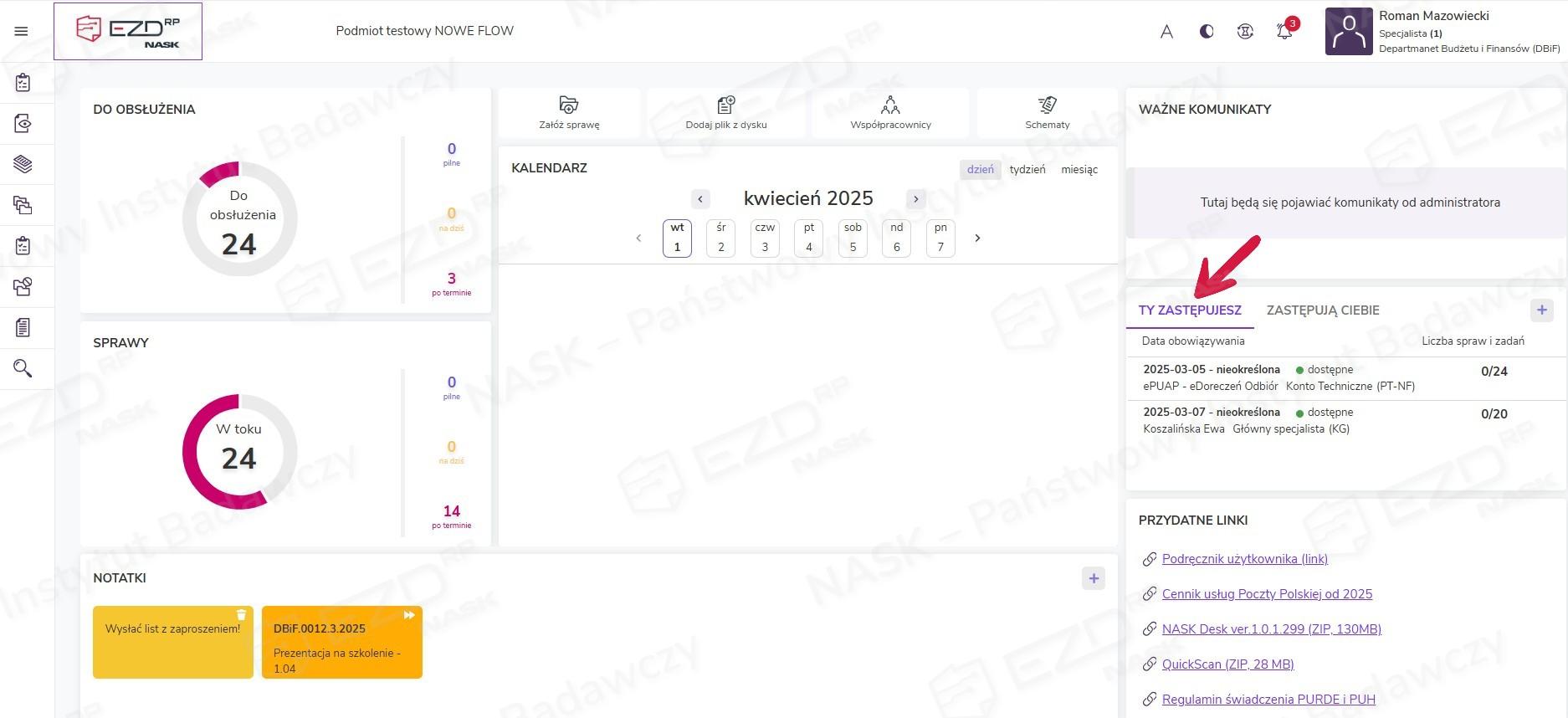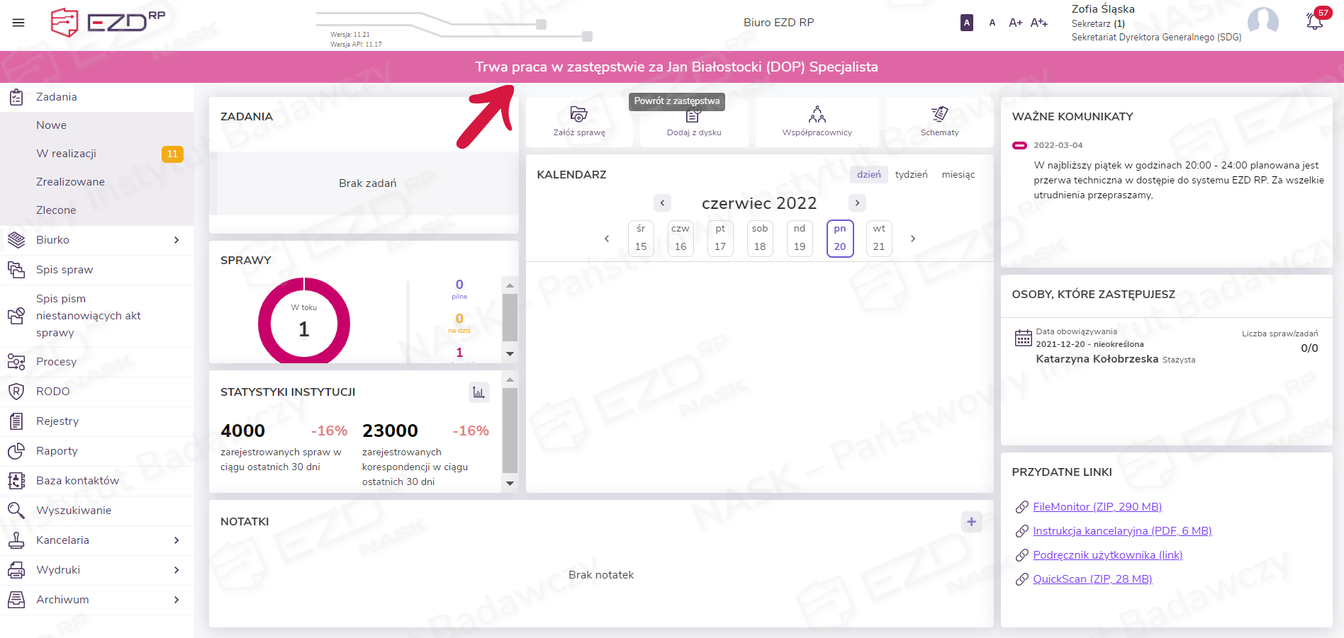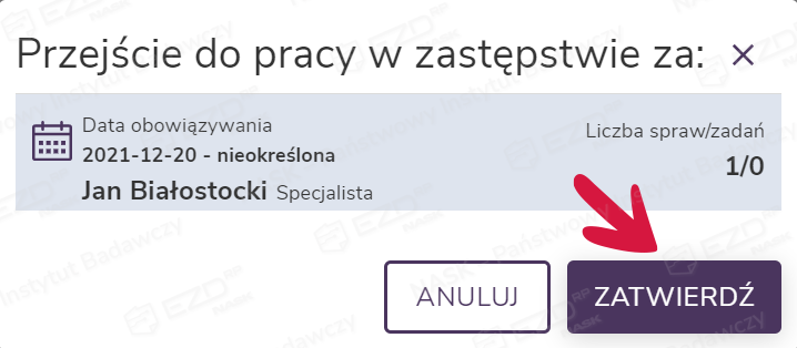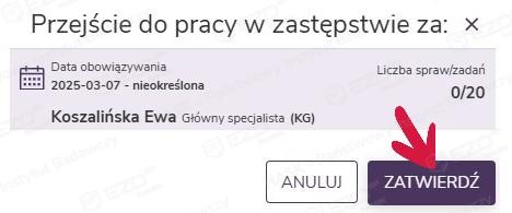 Po kliknięciu przycisku Zatwierdź system przeloguje nas na konto użytkownika zastępowanego i umożliwi realizację jego zadań i prowadzonych spraw.