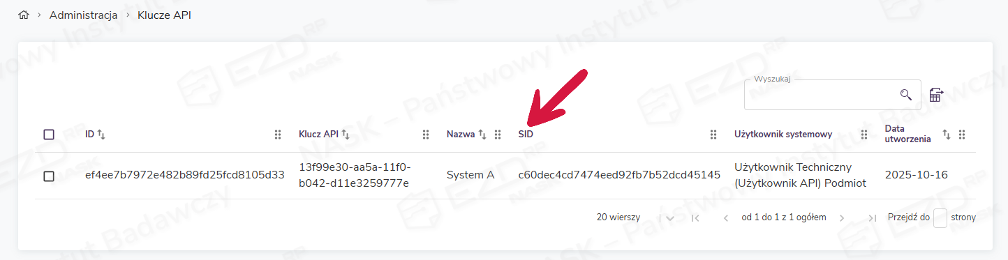 Sid stanowiska, które jest przypisane do klucza API widoczne jest w Administracja > Klucze API.