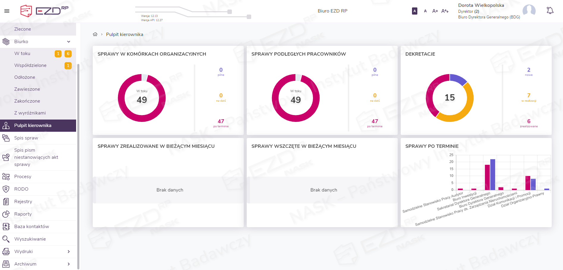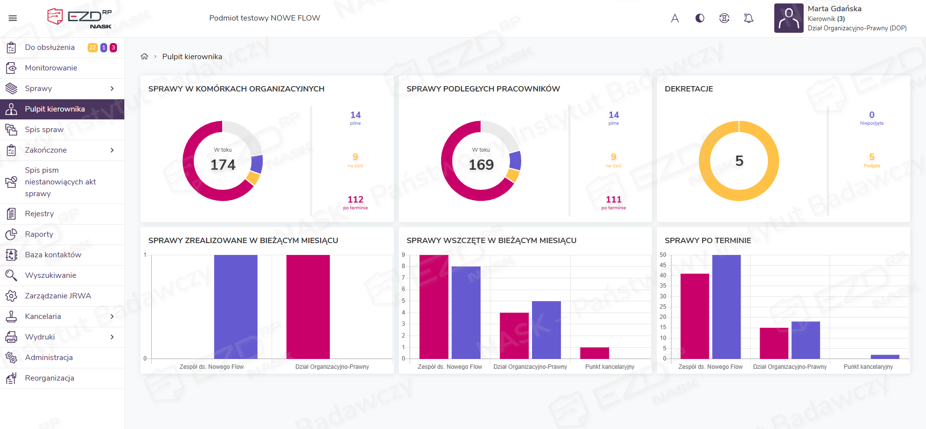 W systemie EZD RP dostępny jest Pulpit kierownika, w którym to module prezentowane są informacje wspierające nadzorowanie przez przełożonych spraw prowadzonych przez pracowników.