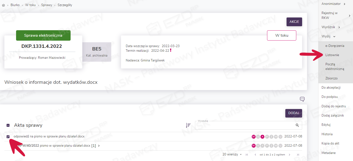 System EZD RP umożliwia rejestrację przez prowadzącego sprawę korespondencji wychodzącej papierowej z poziomu Biurko > W toku > Sprawy. W tym celu należy zaznaczyć jeden lub wiele dokumentów przeznaczonych do wysłania i z prawego menu wybrać funkcję Wyślij > Listownie.