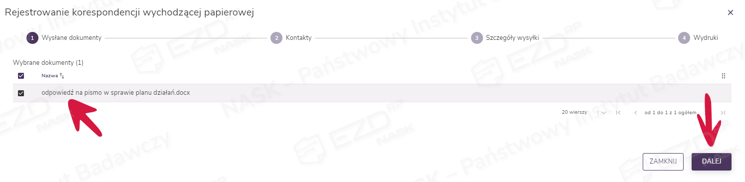 Pojawi się okno Rejestrowanie korespondencji wychodzącej papierowej, gdzie system wskazuje dokumenty wybrane w poprzednim kroku. Klikamy przycisk Dalej.