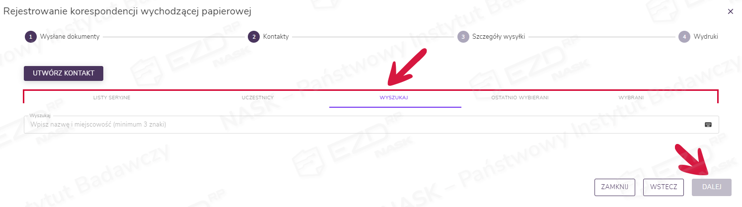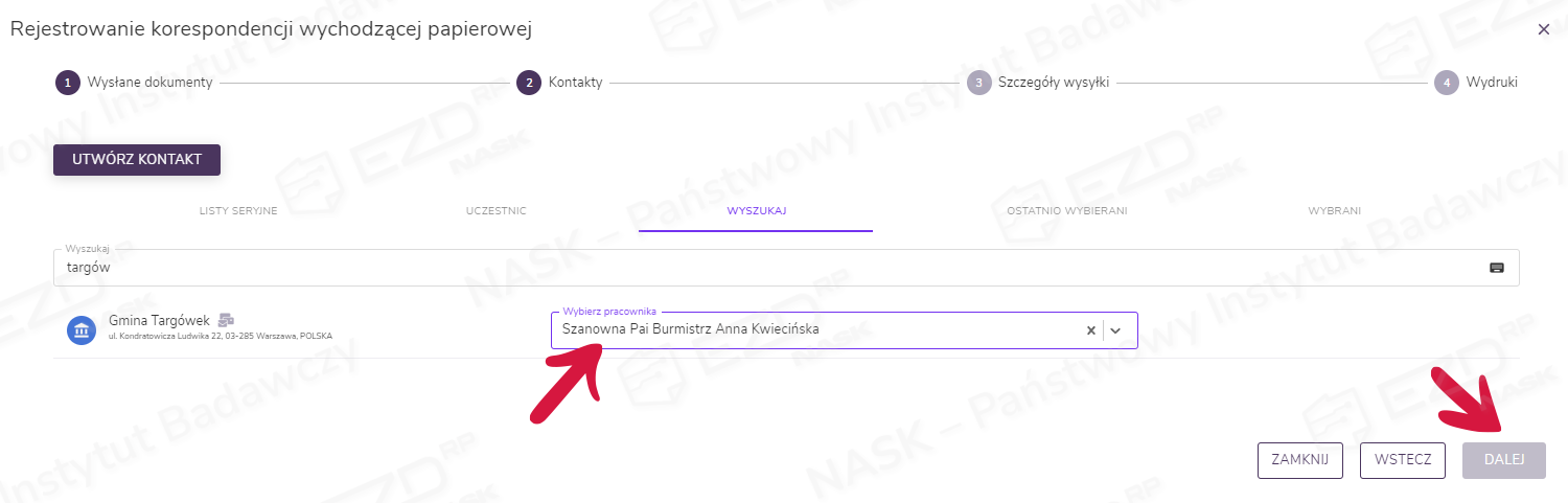 W przypadku, gdy adresat ma kilka lokalizacji lub w bazie znajdują się kontakty do konkretnych pracowników danej instytucji, można doprecyzować kryteria odbiorcy z poziomu wyszukiwarki. Kiedy wszyscy adresaci przesyłki są już wybrani, zatwierdzamy całość, klikając przycisk Dalej.