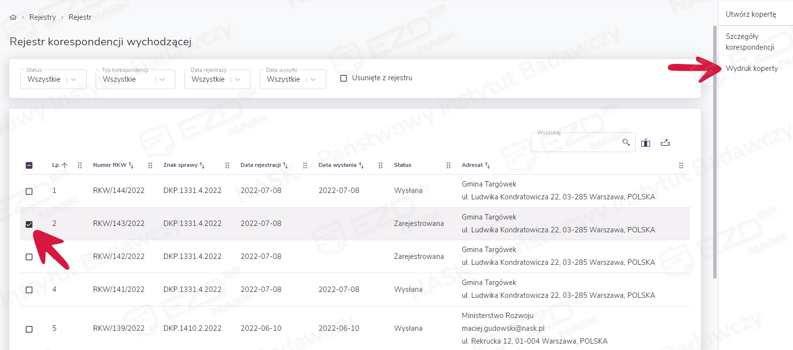 Jeśli użytkownik na swoim stanowisku pracy nie ma możliwości wydrukowania koperty, czynność może wykonać inny użytkownik z poziomu Rejestry > Rejestr korespondencji wychodzącej, który ma dostęp do zarejestrowanej korespondencji wychodzącej w danej komórce organizacyjnej. Po zaznaczeniu odpowiedniej przesyłki RKW w menu pojawi się funkcja Wydruk koperty. Wybieramy format koperty i klikamy przycisk Drukuj.