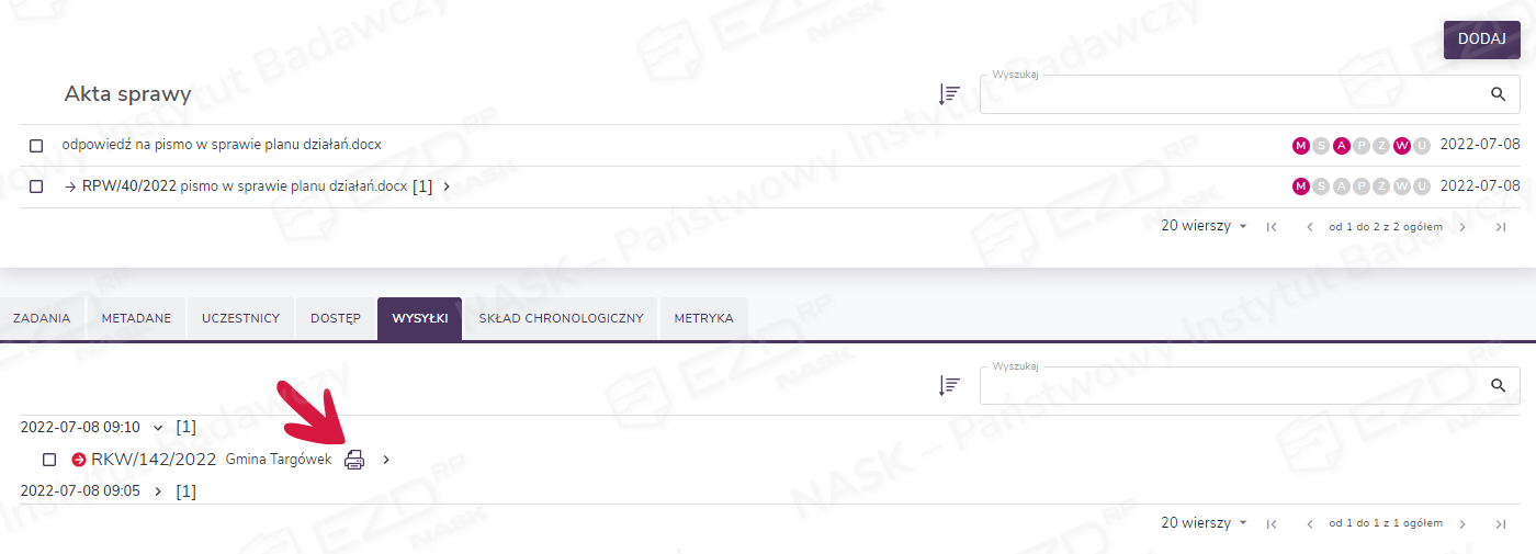 Jeżeli z jakiegoś powodu wydruk koperty nie doszedł do skutku, możemy ją także wydrukować po wejściu do sekcji Biurko > W toku > Sprawy przechodząc do zakładki Wysyłki: