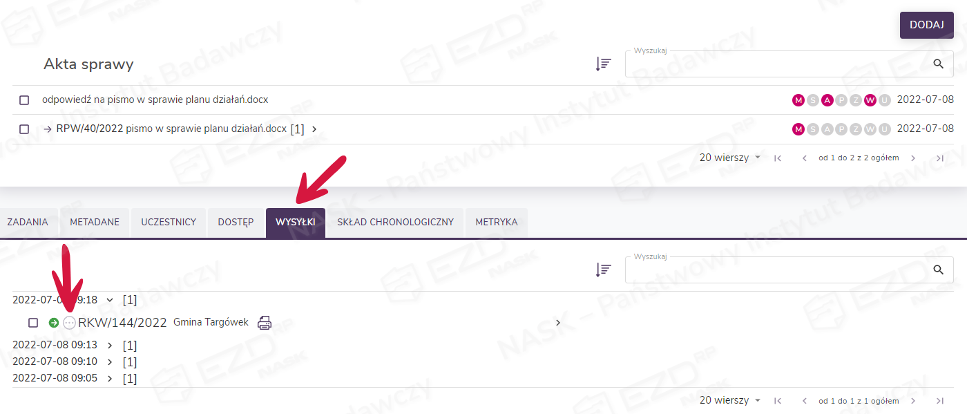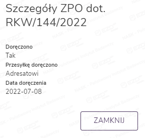 - Jeśli użytkownik zarejestrował wysyłkę za zwrotnym potwierdzeniem odbioru (ZPO), po zwrocie listu lub przyjęciu zwrotki przez kancelarię w sekcji Wysyłki pojawi się dodatkowa ikona symbolizująca zwrotkę.