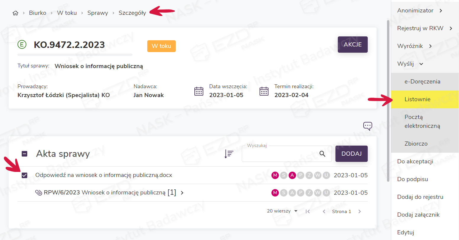 System EZD RP umożliwia rejestrację przez prowadzącego sprawę korespondencji wychodzącej papierowej z poziomu Biurko > W toku > Sprawy. W tym celu należy zaznaczyć jeden lub wiele dokumentów przeznaczonych do wysłania i z prawego menu wybrać funkcję Wyślij > Listownie.