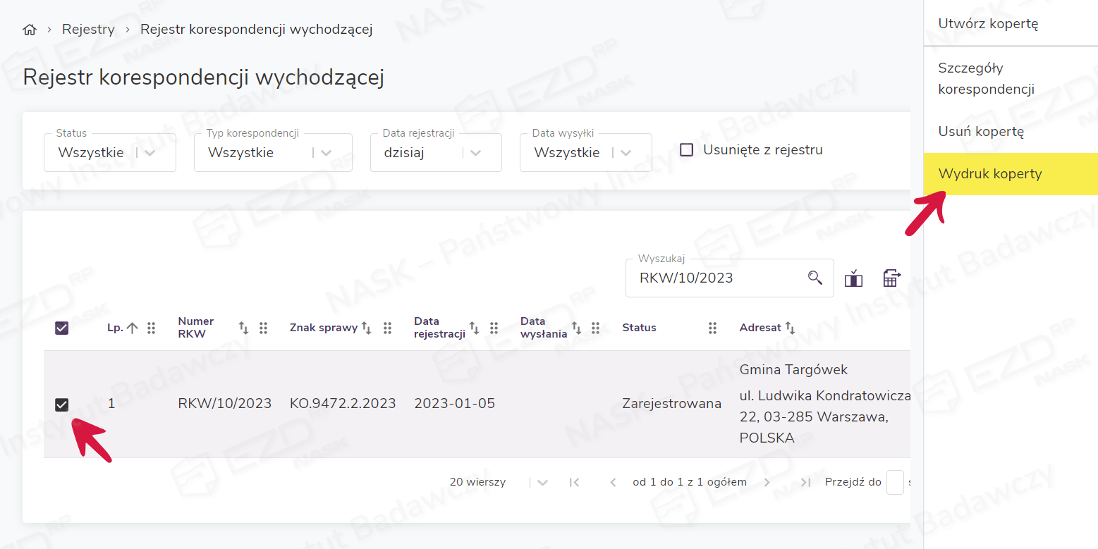 Jeśli użytkownik na swoim stanowisku pracy nie ma możliwości wydrukowania koperty, czynność może wykonać inny użytkownik (np. pracownik kancelarii) z poziomu Rejestry > Rejestr korespondencji wychodzącej. Wystarczy, że ma on dostęp do zarejestrowanej korespondencji wychodzącej w danej komórce organizacyjnej. Po zaznaczeniu odpowiedniej przesyłki RKW, w menu kontekstowym pojawi się opcja Wydruk koperty. Po jej wybraniu należy wskazać format koperty i kliknąć przycisk Drukuj.