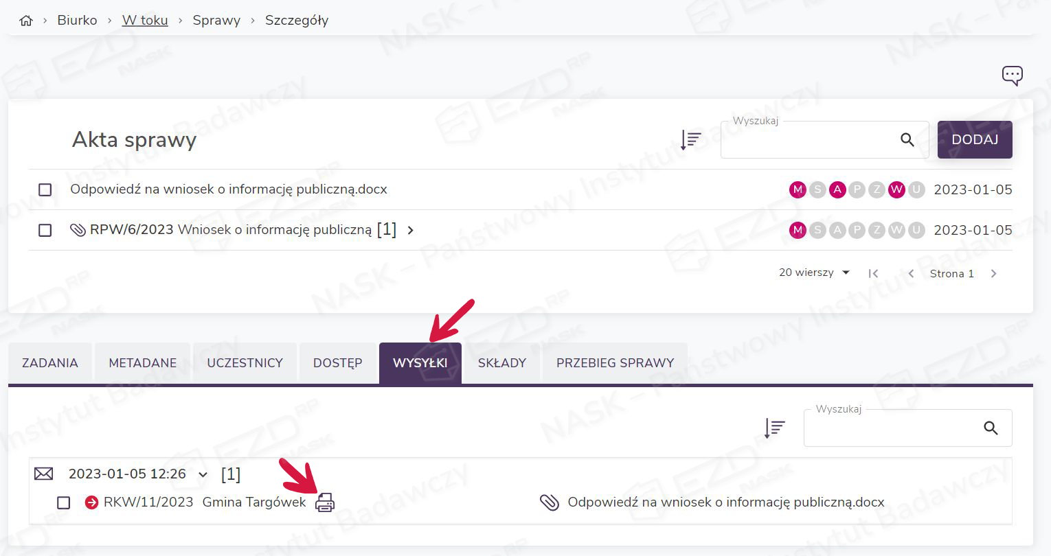 Aby wygenerować potwierdzenie odbioru osobistego, należy wybrać zakładkę Wysyłki w aktach sprawy, pozycję zawierającą naszą przesyłkę, a następnie kliknąć ikonę drukarki obok nazwy adresata.