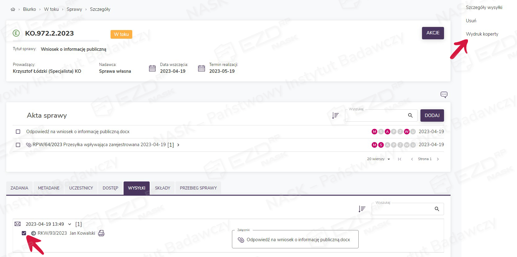 Kopertę możemy także wydrukować z poziomu szczegółów sprawy, przechodząc do zakładki Wysyłki. Jeśli użytkownik przy rejestracji korespondencji nie wygenerował wydruku, ikona drukarki nie będzie dostępna. Innym sposobem na wydrukowanie koperty jest zaznaczenie pola wyboru przy przesyłce. Wówczas wyświetli się menu kontekstowe, gdzie dostępna będzie opcja Wydruk koperty.