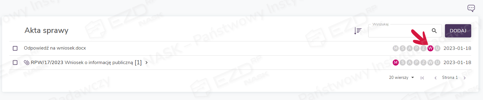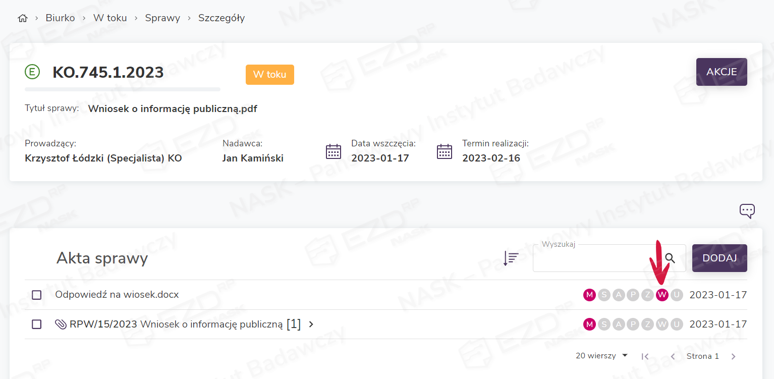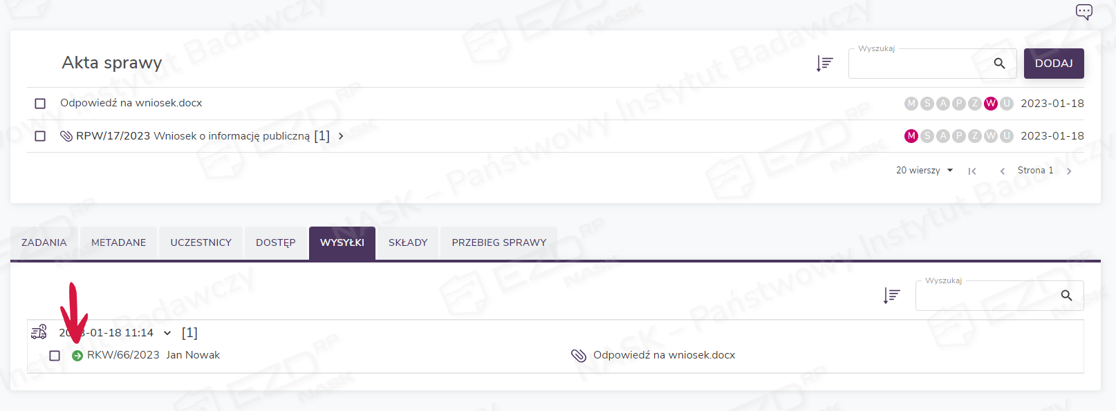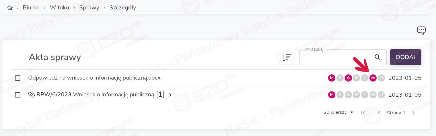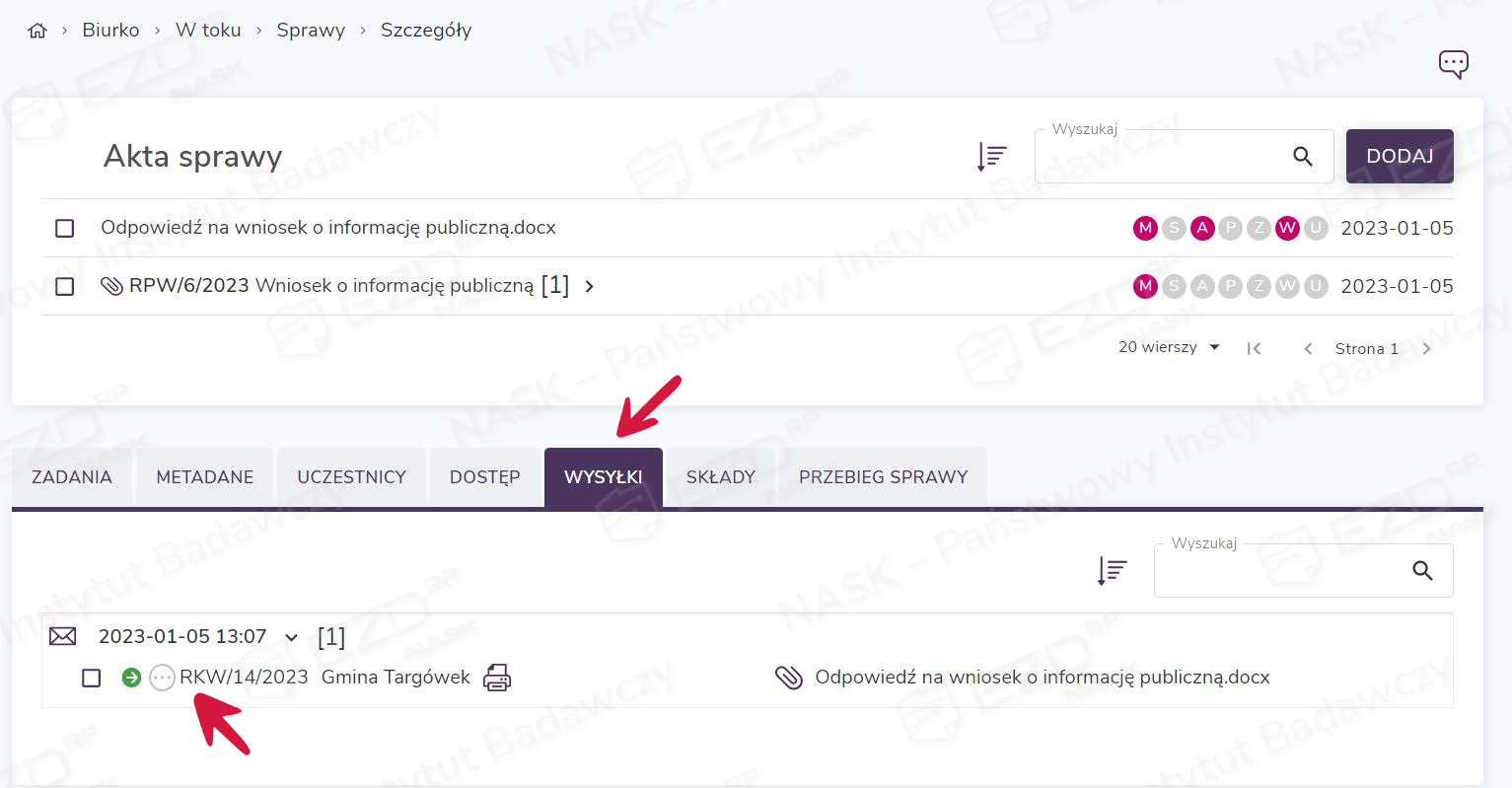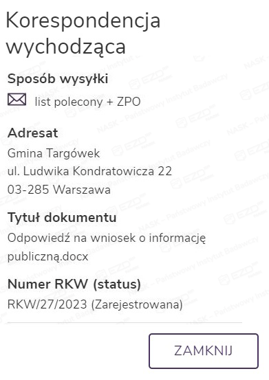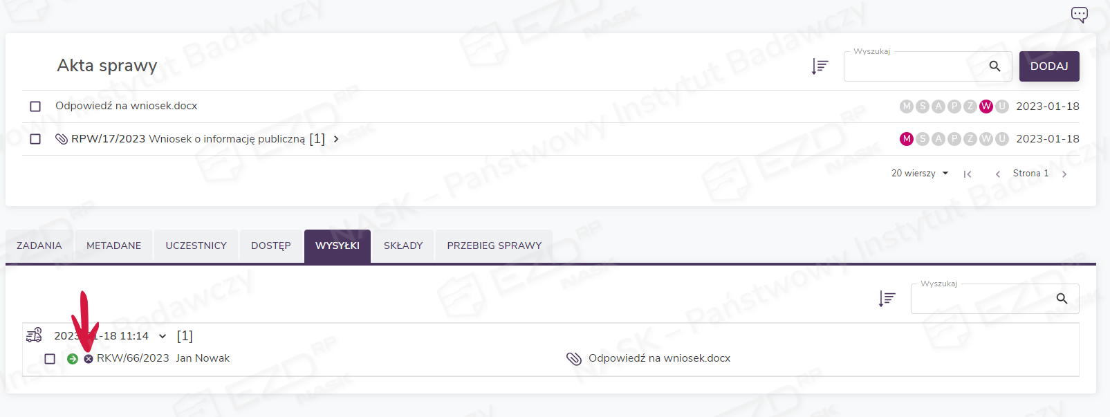 Aby zapoznać się ze szczegółami wysyłki korespondencji, użytkownik musi kliknąć aktywną ikonę statusu z literą W (wysyłka).