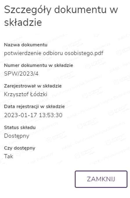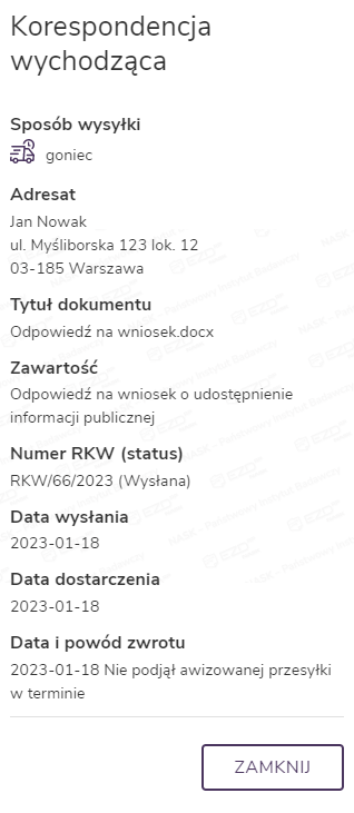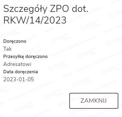Gdy ZPO zostanie zarejestrowane przez kancelarię, po kliknięciu ikony zwrotki wyświetli się panel boczny ze szczegółami na jej temat.