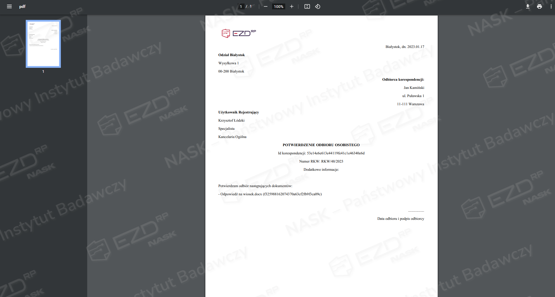 W oddzielnym oknie pojawi się wygenerowane potwierdzenie odbioru z uzupełnionymi danymi. Dokument ten będzie gotowy do wydrukowania.