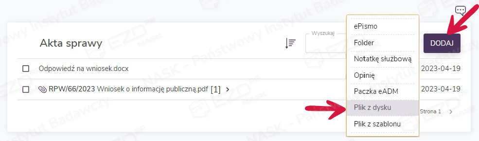 Po podpisaniu dokumentu odbioru należy go zeskanować i dołączyć do akt sprawy. Aby to zrobić, należy kliknąć przycisk Dodaj i wybrać opcję Plik z dysku.