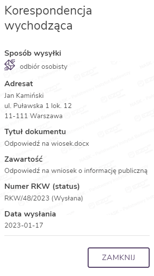 W systemie dostępna jest opcja przekazania korespondencji poprzez odbiór osobisty. Aby z niej skorzystać, należy postępować zgodnie z opisanymi na początku artykułu krokami, aż do momentu, gdy w oknie Rejestrowanie korespondencji wychodzącej papierowej zostaną wyświetlone szczegóły wysyłki.