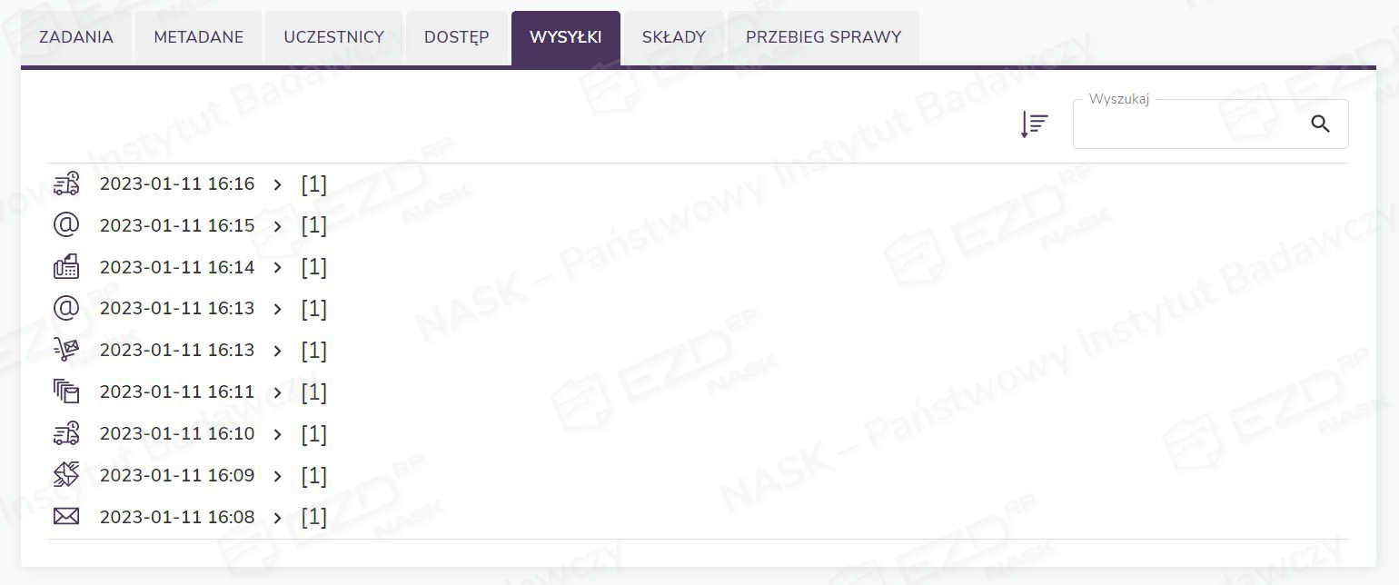 Lista korespondencji w zakładce Wysyłki wyświetlana jest w kolejności chronologicznej. Ikona przy dacie wysyłki natomiast informuje nas o formie, w jakiej korespondencja została wysłana