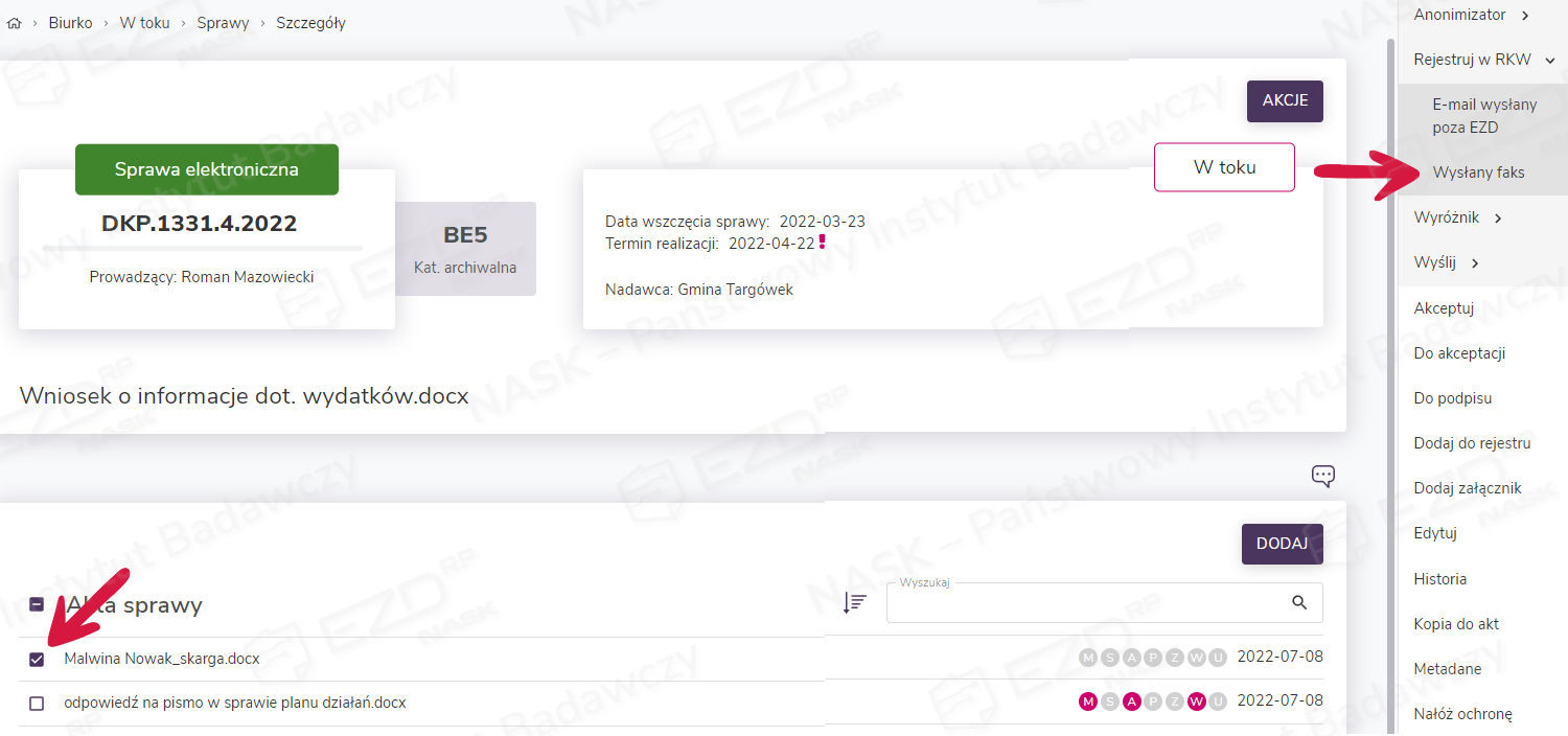 Rejestrowanie korespondencji wychodzącej w formie faksu odbywa się nieco inaczej niż rejestrowanie korespondencji wychodzącej papierowej. W aktach sprawy zaznaczamy dokument przeznaczony do wysłania i z prawego menu wybieramy funkcję Rejestruj w RKW > Wysłany faks.