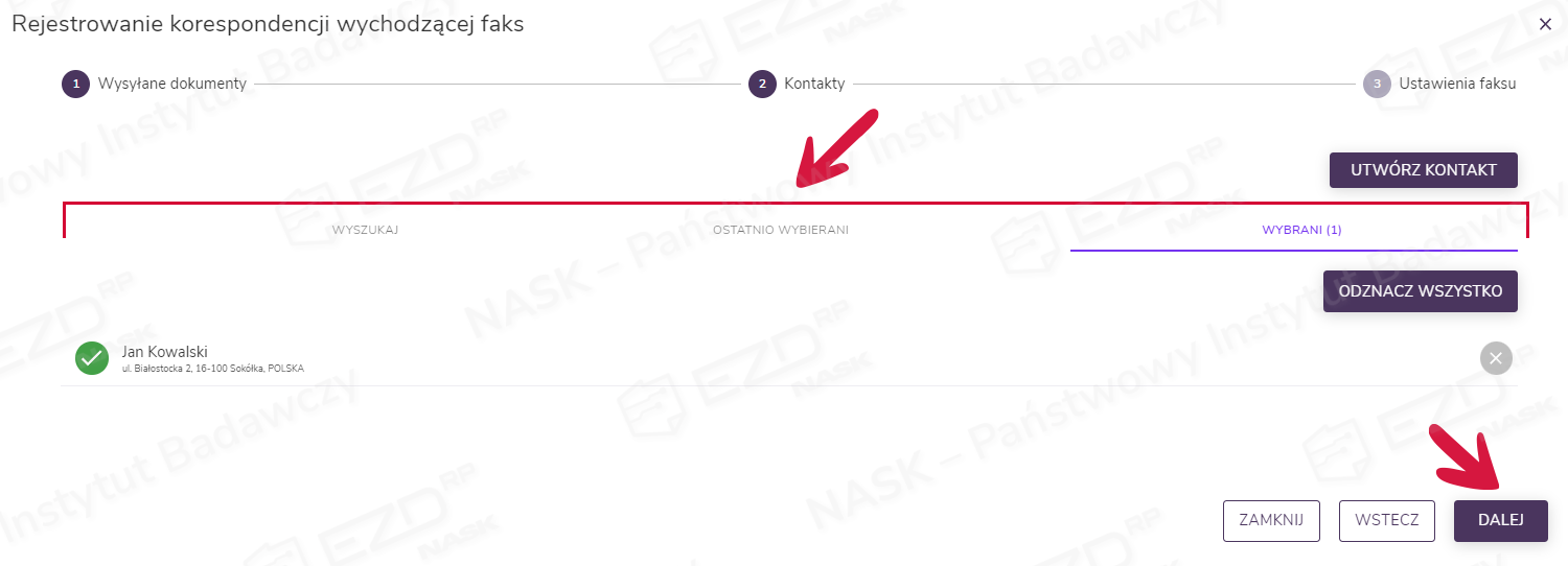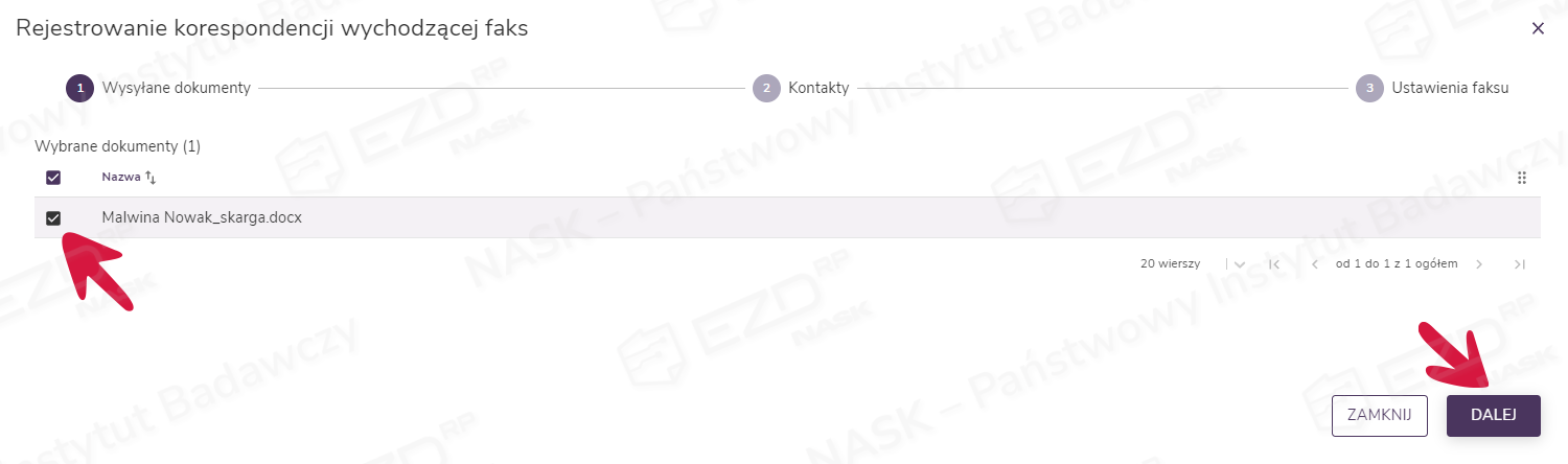 Wyświetli się okno Rejestrowanie korespondencji wychodzącej faks z listą dokumentów, które system załączył do wysyłki. Klikając przycisk Dalej, przechodzimy do następnego kroku, gdzie wskazujemy odbiorców korespondencji.
