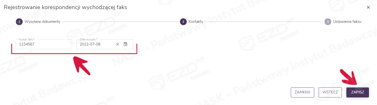 W ostatnim kroku podajemy numer faksu i podajemy datę wysyłki. Klikamy przycisk Zapisz.
