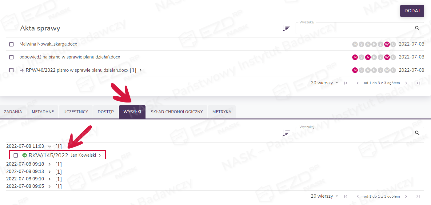 Zarejestrowany faks pojawi się w zakładce Wysyłki w aktach sprawy.