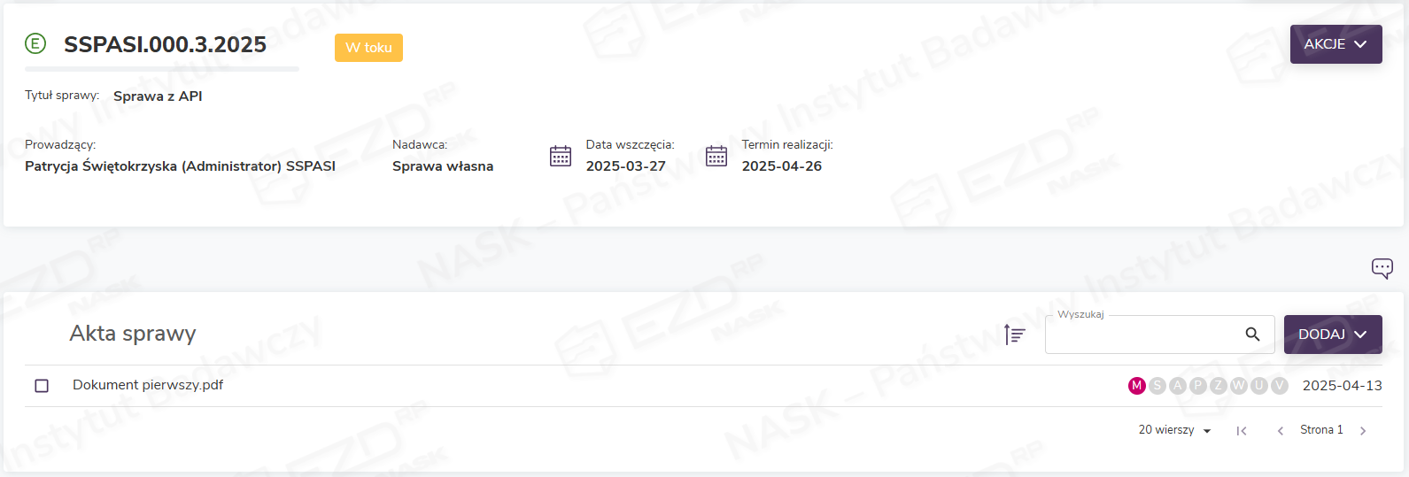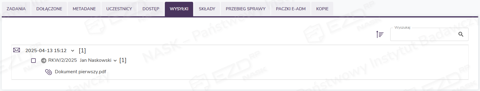 Widok w systemie w sekcji Wysyłki w sprawie: