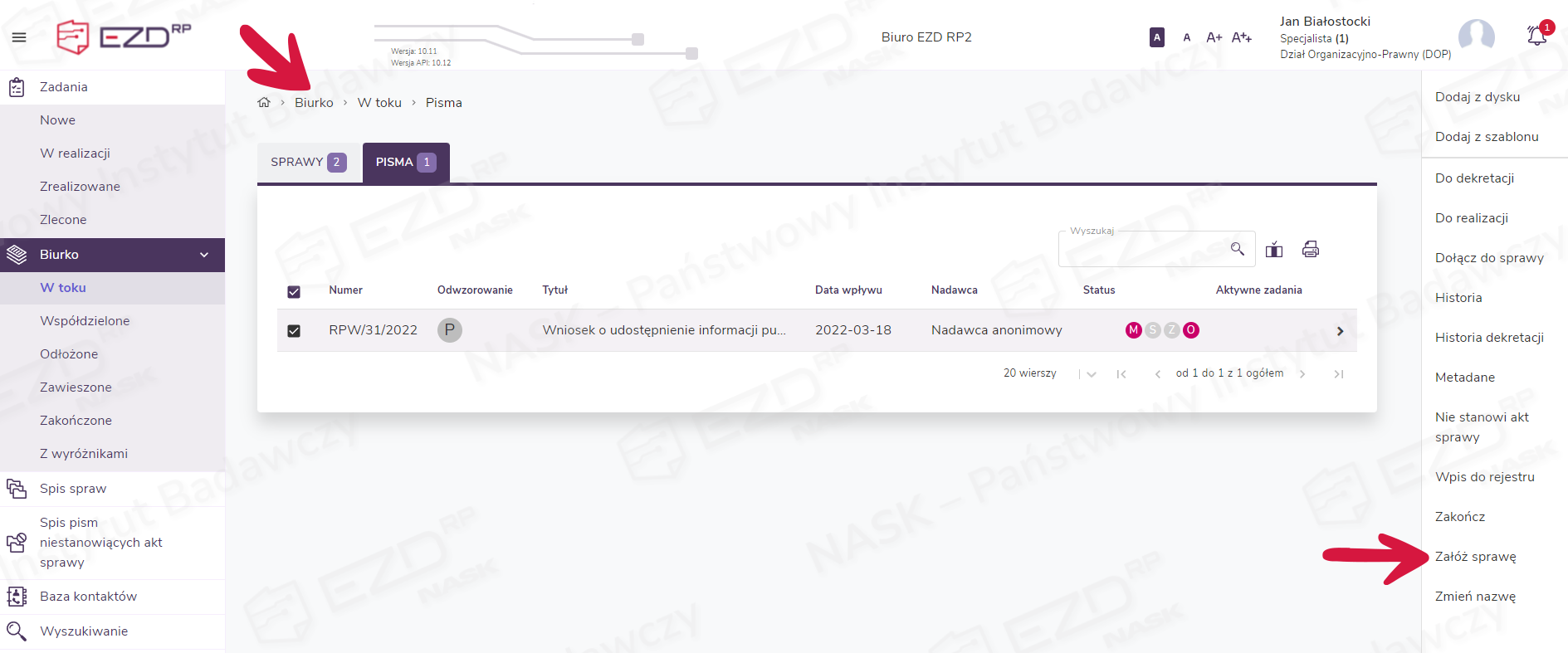 Po dodaniu roczników i włączeniu możliwości zmiany automatycznej numeracji przez administratora (patrz opis poniżej) można założyć sprawę i samodzielnie nadać jej numer. Aby to zrobić, należy przejść do widoku Biurko > W toku > Pisma. Następnie zaznaczamy pismo, dla którego chcemy założyć sprawę. Po zaznaczeniu pola wyboru pojawi się menu kontekstowe, gdzie należy kliknąć Załóż sprawę.