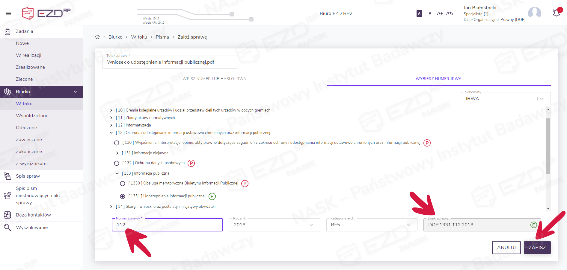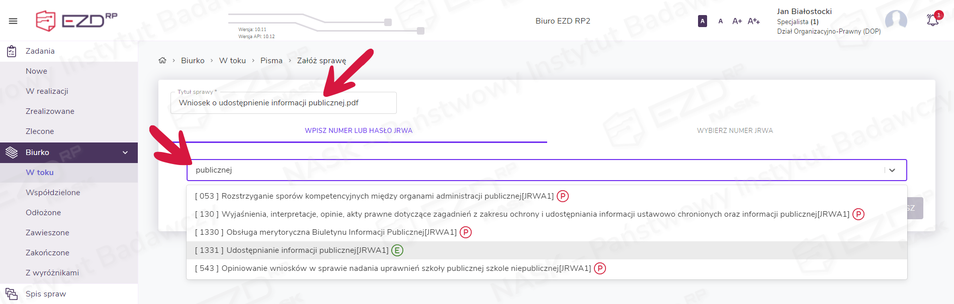 System przenosi do okna, w którym należy wskazać klasę z JRWA (Jednolity Rzeczowy Wykaz Akt) odpowiadającą zakładanej sprawie. Można to zrobić, wpisując numer lub fragment hasła JRWA.