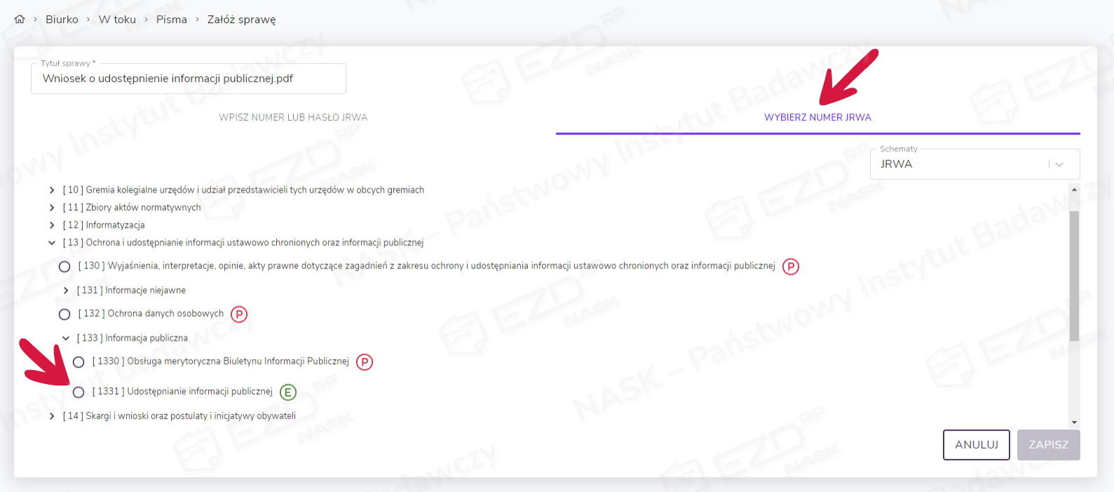 Drugim sposobem jest wybranie klasy z wykazu rzeczowego, który jest prezentowany w formie drzewa JRWA.