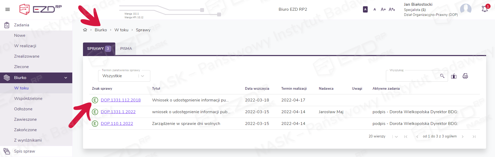 Poprawnie zarejestrowana sprawa znajdzie się w widoku Biurko > W toku > Sprawy oraz w spisie spraw dla danej instancji.