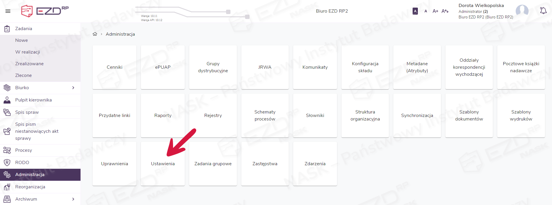 Aby skonfigurować odpowiednie ustawienia, użytkownik z uprawnieniami administratora w menu głównym wybiera moduł Administracja, a następnie klika kafelek Ustawienia.