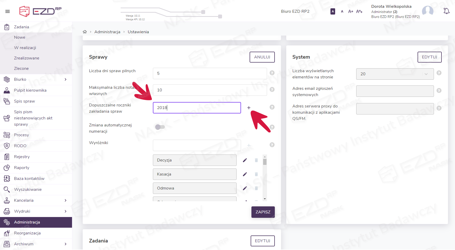 W polu Dopuszczalne roczniki zakładania spraw administrator wpisuje kolejno roczniki, w których będzie możliwość zakładania spraw. Wpisaną wartość zatwierdza, klikając przycisk dodawania (ikona z symbolem plusa).