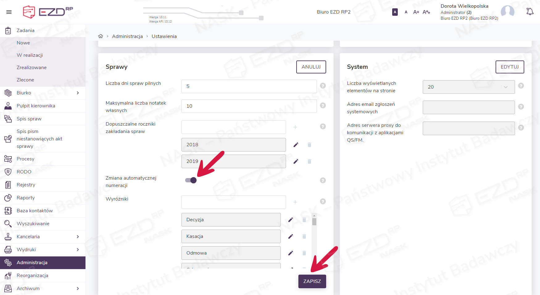 Następnie należy włączyć opcję Zmiana automatycznej numeracji, aby umożliwić użytkownikom samodzielne wpisywanie numeru sprawy podczas jej rejestracji. Nowe ustawienia zatwierdzamy klikając przycisk Zapisz.