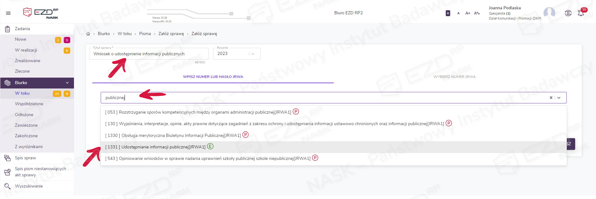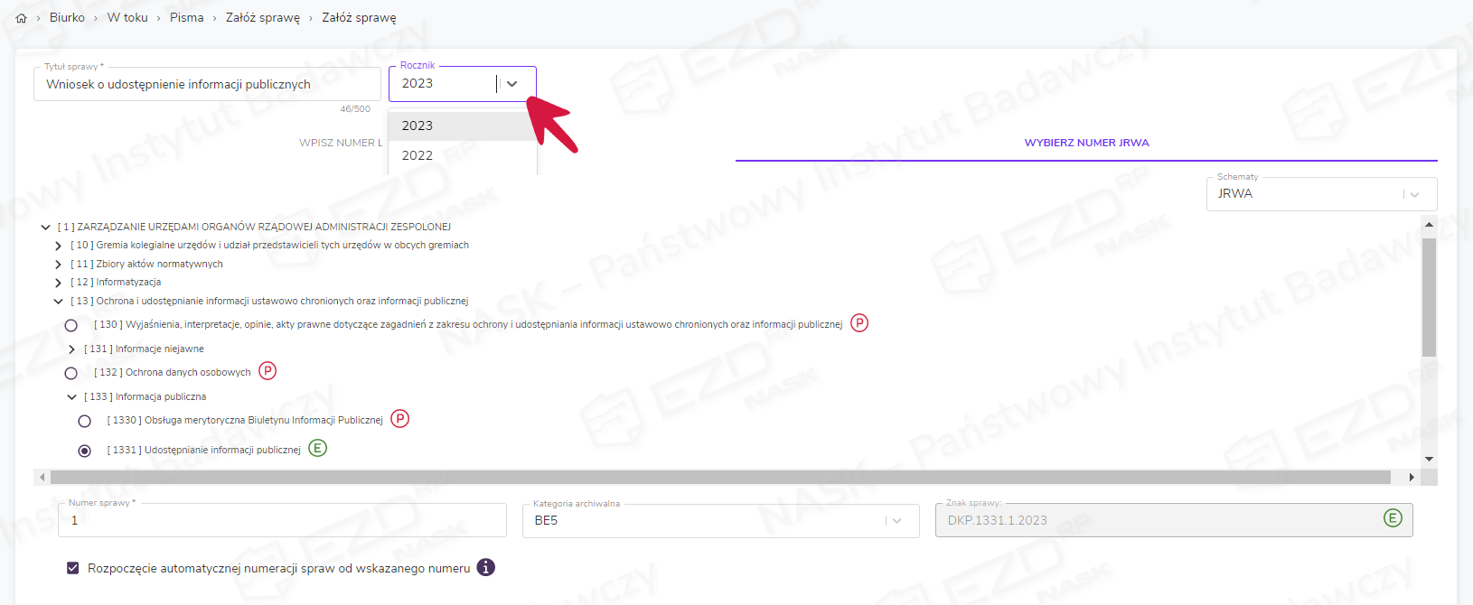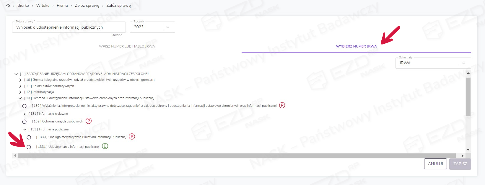 Następnie użytkownik powinien wskazać klasę z jednolitego rzeczowego wykazu akt (JRWA) odpowiadającą zakładanej sprawie. Można to zrobić, wpisując numer lub fragment hasła JRWA.