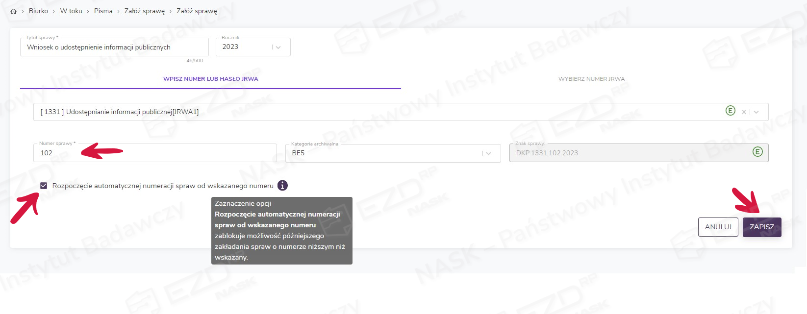 Zapisanie wprowadzonych ustawień umożliwi samodzielną zmianę podpowiadanego numeru sprawy podczas jej zakładania.