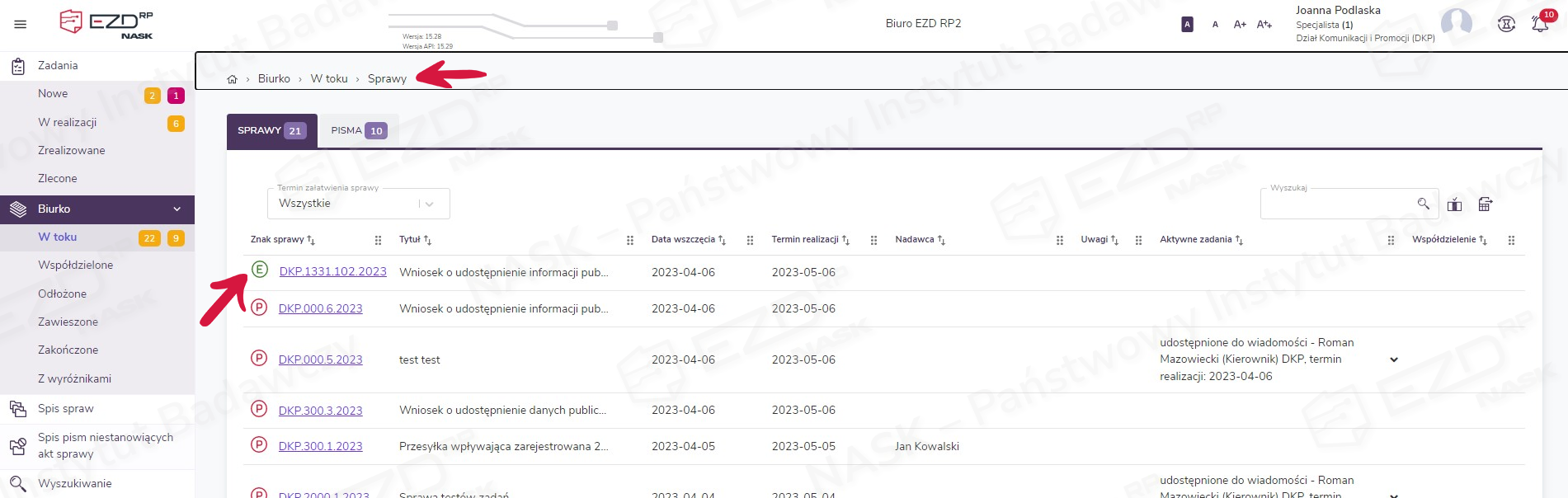 Poprawnie zarejestrowana sprawa znajdzie się w widoku Biurko > W toku > Sprawy oraz w spisie spraw dla danej instancji.